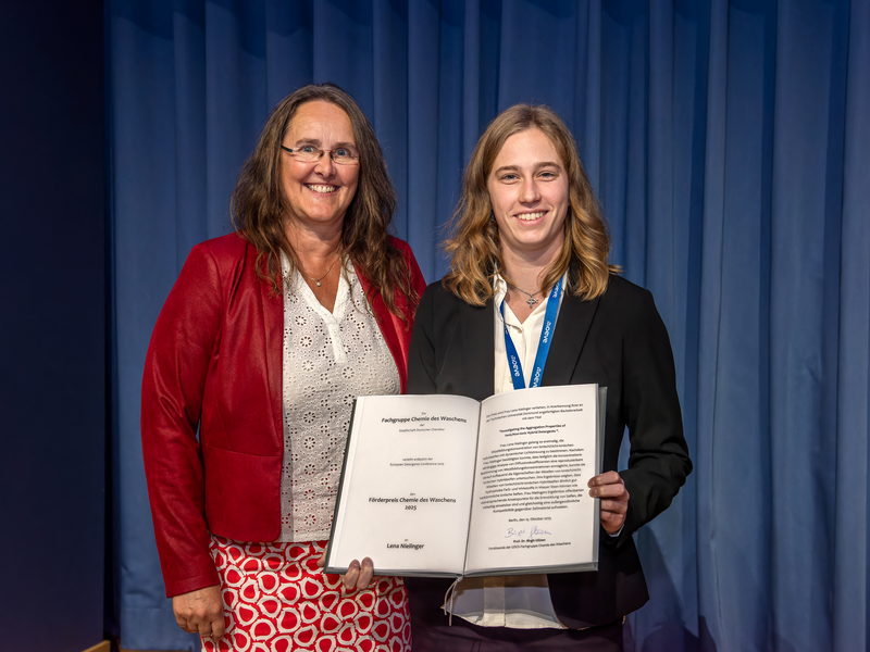 Anlässlich der European Detergents Conference am 15. Oktober 2025 in Berlin verlieh die Fachgruppe Chemie des Waschens die 2025er Förderpreise an Lena Nielinger (TU Dortmund) und Moritz Stanek (Henkel / Universität Wuppertal).