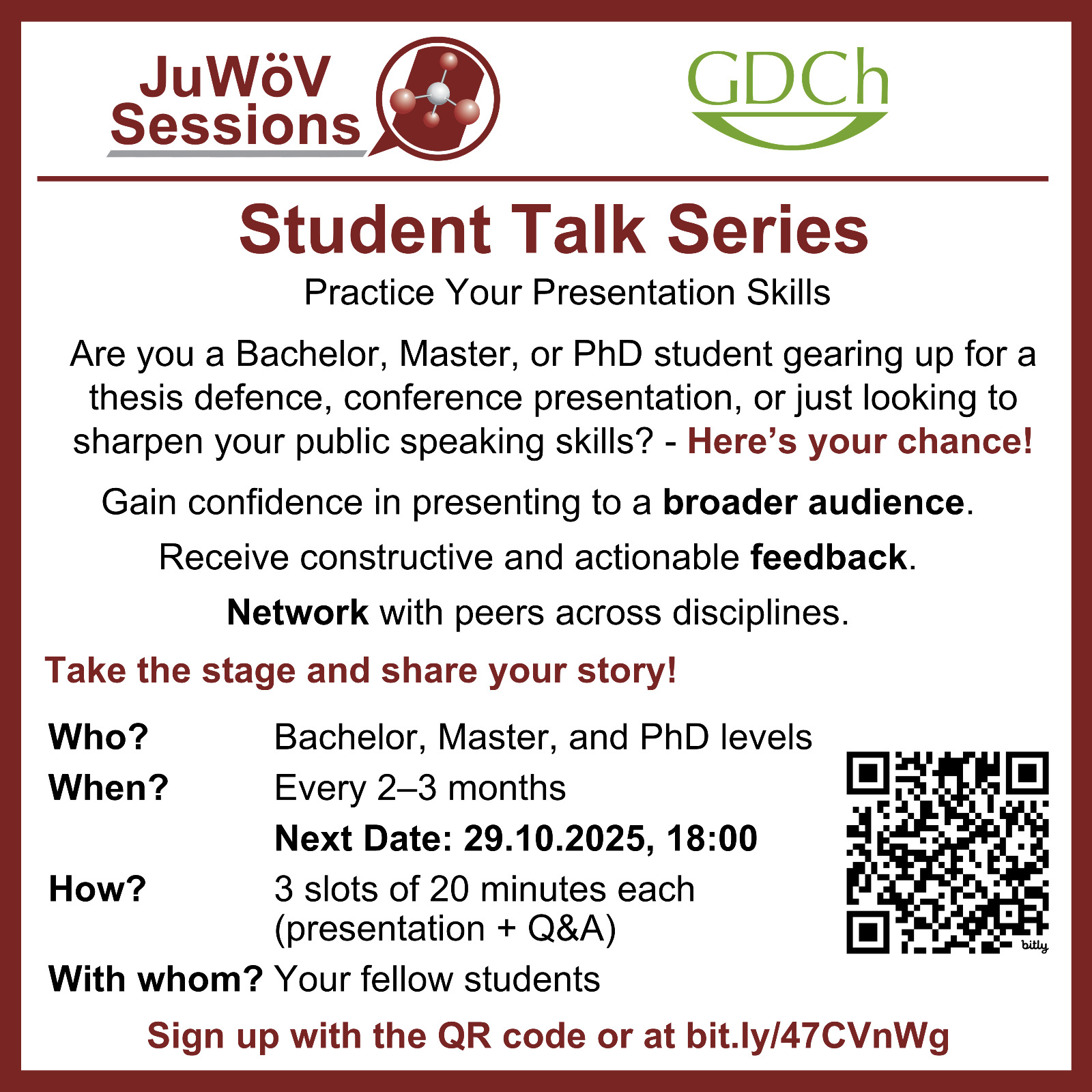 Über die Mitgliedschaft in der Wöhler-Vereinigung und der GDCh ergibt sich für studentische und junge Mitglieder eine automatische Mitgliedschaft in der Jugendorganisation JuWöV.