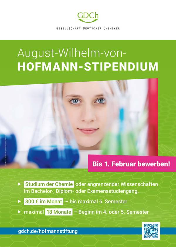 Zum Sommersemester 2026 vergibt die bei der Gesellschaft Deutscher Chemiker (GDCh) eingerichtete August-Wilhelm-von-Hofmann-Stiftung erneut Stipendien. Bachelor-, Diplom- oder Examensstudierende der Chemie und angrenzender Gebiete können ab April 2026 für bis zu 18 Monate eine Förderung in Höhe von 300 Euro pro Monat erhalten. Bewerbungen sind bis zum 1. Februar 2026 über das Online-Portal möglich.